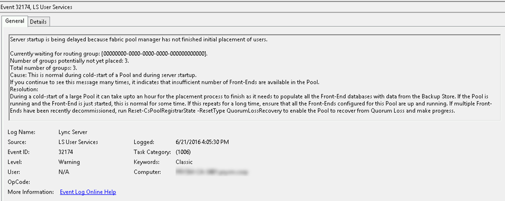 There was a false negative warning about Event ID 32174 “Server startup is being delayed because fabric pool manager has not finished initial placement of users.” This is clearly a bogus error because a Front-End server doesn’t have additional servers to place users into.