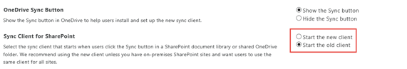 As you can see in the screen shot below, the setting for ‘Sync Client for SharePoint’ defaults to ‘start the old client’.