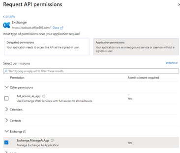 - Expand the Exchange entry, and select the Exchange.ManageAsApp permission.