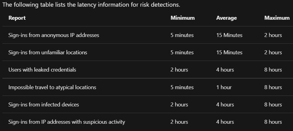 Here are the latencies associated with when the risk detections will appear: