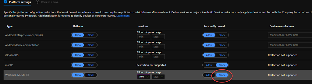 Endpoint.Microsoft.com > Devices > Enroll Devices > Enrollment Device Platform Restrictions