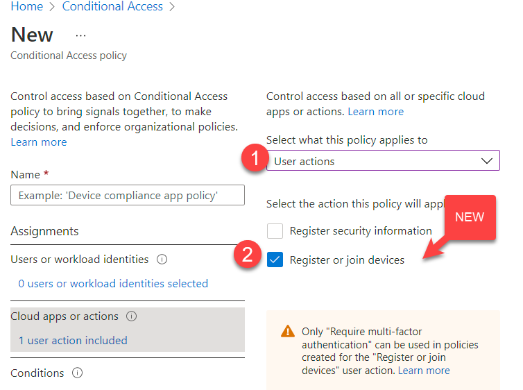 If you want more granularity you can set the setting above to No and then configure it in Conditional Access Policy to force MFA when registering or joining