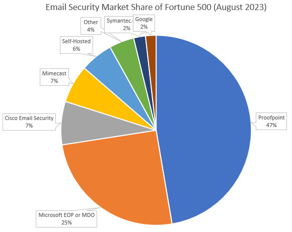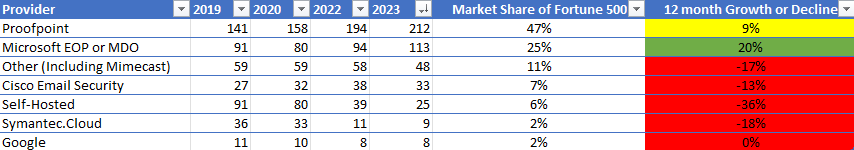 So even though ProofPoint has almost half the email security market, Microsoft is steadily growing at a faster clip than ProofPoint. All other email security vendors have declined over the past 12 months.