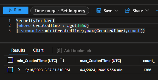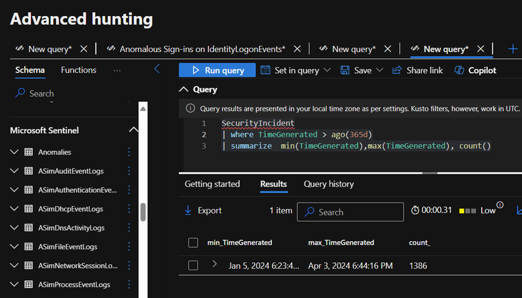 My first test was to see if the synchronization of the SentinelIncident table is limited by the 30 day KQL History of the Advanced Hunting experience.