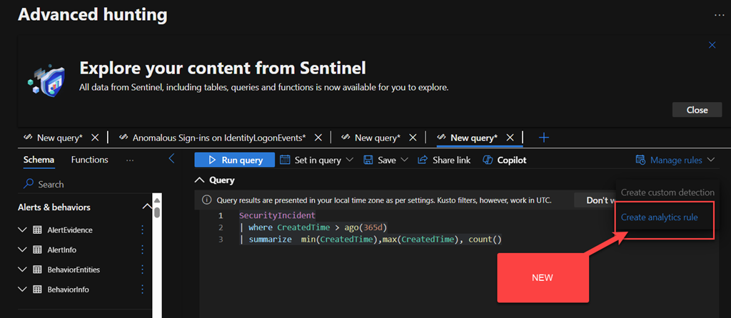You can also create Analytics Rules from within the Defender Advanced Hunting interface: